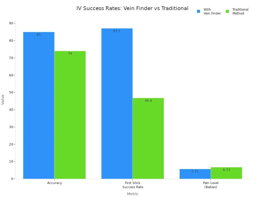 You see how a nurse vein finder transforms IV procedures in hospitals. Devices like Vivolight Projection Vein Finder raise first-attempt success rates from 46.8% to 87.1%. This means you achieve more accurate venipuncture and reduce patient pain. The following table shows the improvement when you use a nurse vein finder:
