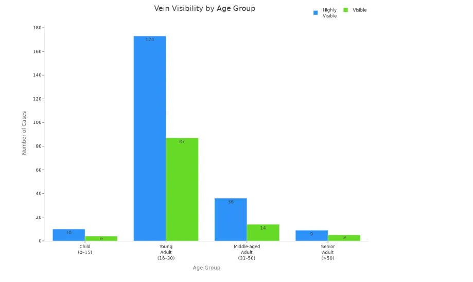 You may notice that vein finder technology does not always deliver the same results for every patient. Several factors can influence how well you can visualize veins and achieve successful venipuncture attempts. Age and skin tone play a major role in vein visibility. Younger adults tend to have more highly visible veins compared to seniors and children. The following table shows how age affects vein visibility: